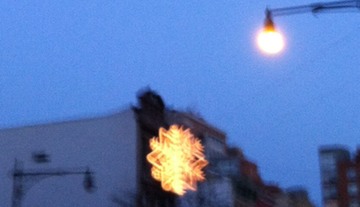 The combination of artificial and natural light in this city often gives the early evening a surreal quality. Here, the leftover holiday light hangs seemingly magically; it's surrounded by the cooler light of the newly fluorescent street-light bulb, all set against the beautiful bright blue of the winter evening sky. And I thank goodness for New York's stubborn imperfection, the street light on the left is not working, creating a nice asymmetry to put you a little off balance.
